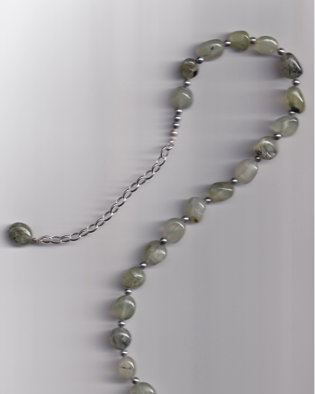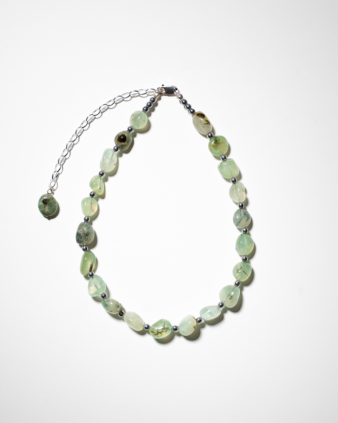 Irregular 12mm prehnite beads in washed green tones, paired with premium 925 sterling silver hardware and a belcher chain extender at the clasp. One last prehnite bead balances the back — a small detail, but intentional.