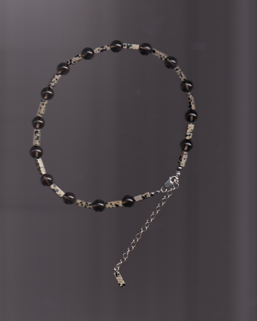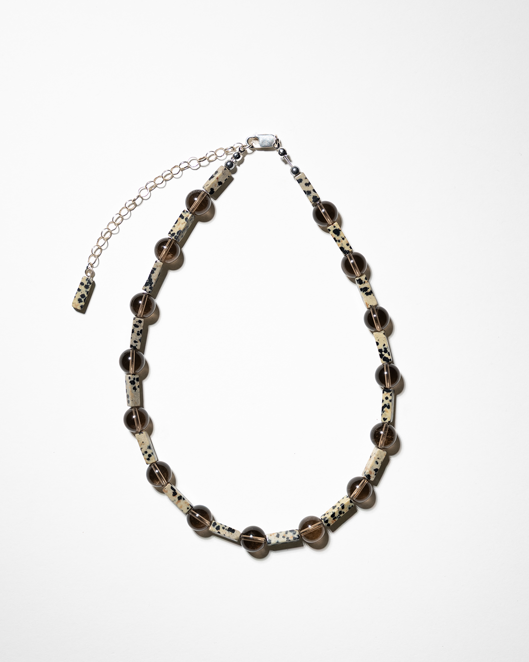10mm round smoked quartz and cuboid cuts of dalmatian jasper — a sharp mix of smoky translucence and stone-flecked contrast. Finished with 925 sterling silver hardware and a 10cm belcher chain extender, detailed with one final bead to tie it all together.