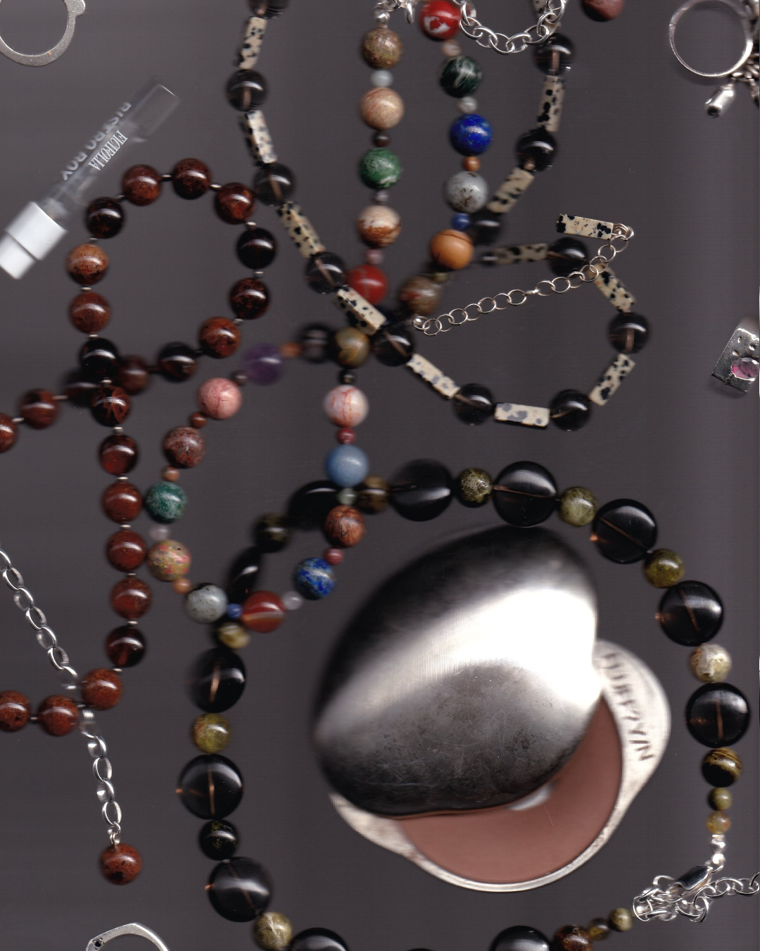 Smoked quartz is said to clear the mind, while dalmatian jasper brings a steady, grounding energy. Whether you're in it for the meaning or the clash of surfaces, this one's got range.