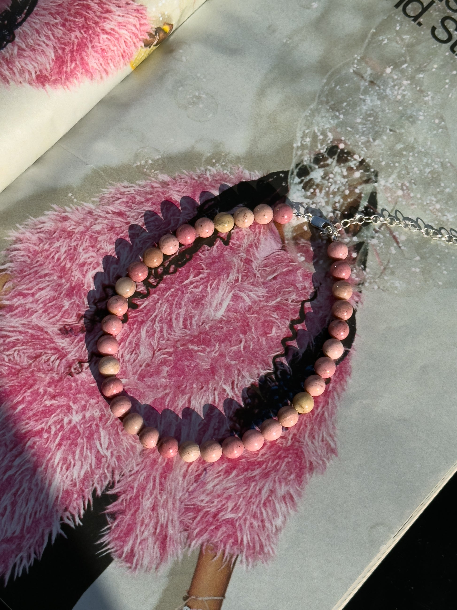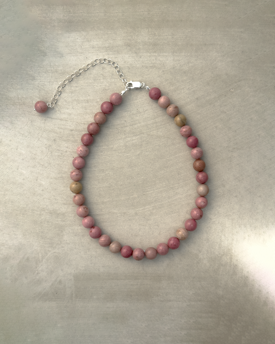 If your jewellery collection needs a hint of pink that’s equal parts sweet and sophisticated, Rhodonite will do the trick. This piece showcases dusty rose tones with gentle striations—like you’re wearing a fresh bouquet right on your collarbone.