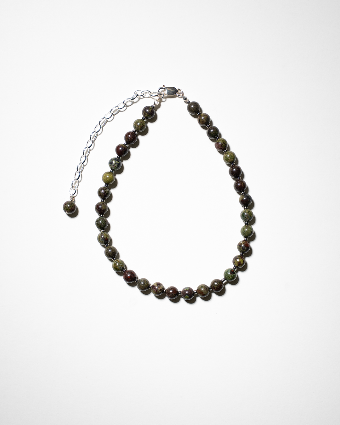 8mm Dragon’s Blood jasper beads threaded with recycled 2mm delica seed beads — a mix of deep moss green and muted red tones, with fine breaks of space and structure. Finished with 925 sterling silver hardware and a 10cm belcher chain extender, closed with one final jasper bead at the clasp.