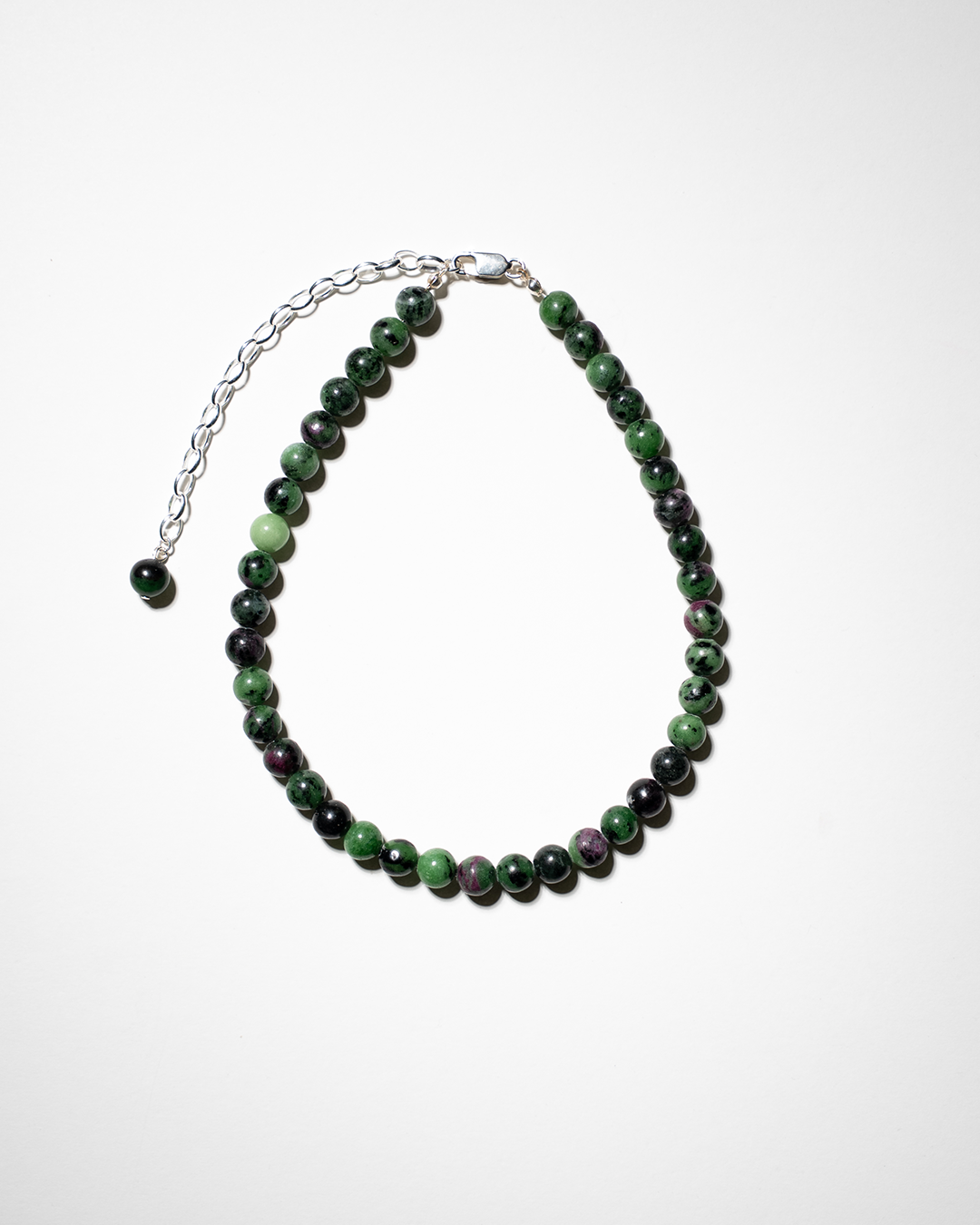 8mm round ruby zoisite beads — a natural clash of moss green and deep magenta, marbled across the strand in unpredictable rhythm. Finished with 925 sterling silver hardware and a 10cm belcher chain extender, tipped with a final ruby zoisite bead.