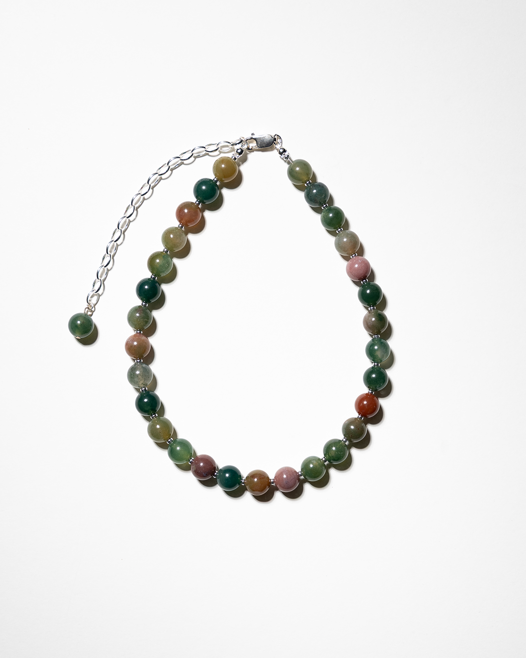10mm round Indian agate beads interspersed with 2mm recycled spacers — a palette of soft greens, pinks, and purples, broken up with spacing that gives each tone room to land. Finished with 925 sterling silver hardware and a 10cm belcher chain extender, closed with a final Indian agate bead.