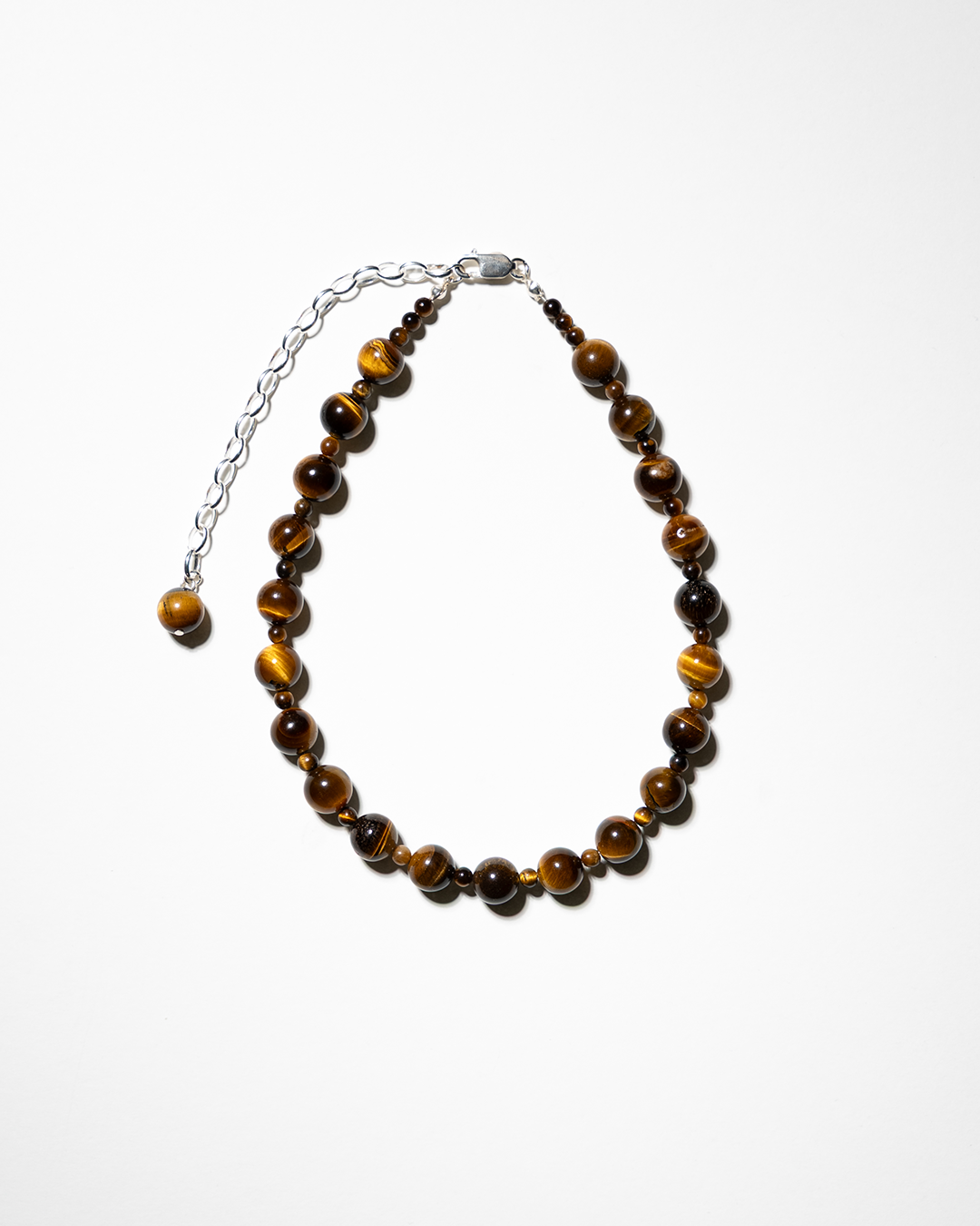 10mm and 4mm round tiger’s eye beads in warm bronze and caramel tones — a double scale that adds rhythm without overcomplicating. Finished with 925 sterling silver hardware and a 10cm belcher chain extender, closed with a final tiger’s eye bead.