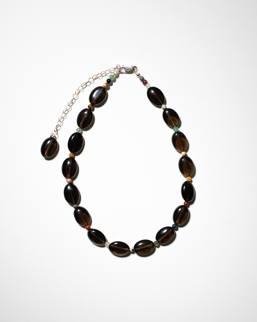 18x12mm flat oval smoked quartz beads paired with 4mm mixed stones — a high-contrast mix of scale and finish, with large smoky glassy forms broken by tiny hits of texture and tone. Finished with 925 sterling silver hardware and a 10cm belcher chain extender, sealed with one last smoked quartz bead.