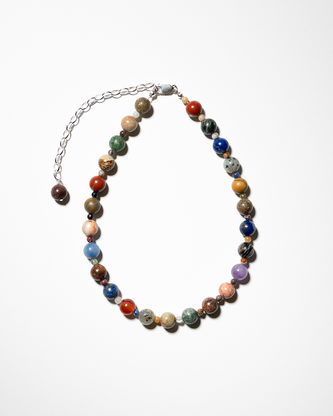 10mm and 4mm mixed round stones — a clash of colour, scale, and finish designed to feel joyful, not chaotic. Finished with 925 sterling silver hardware and a 10cm belcher chain extender, closed with one final bead pulled from the mix.