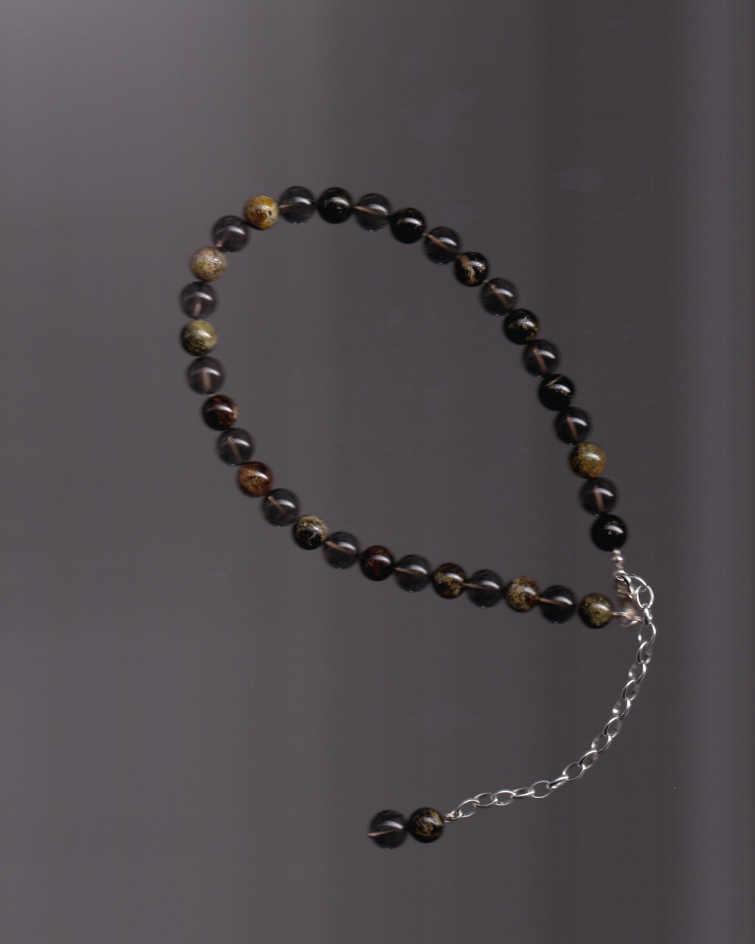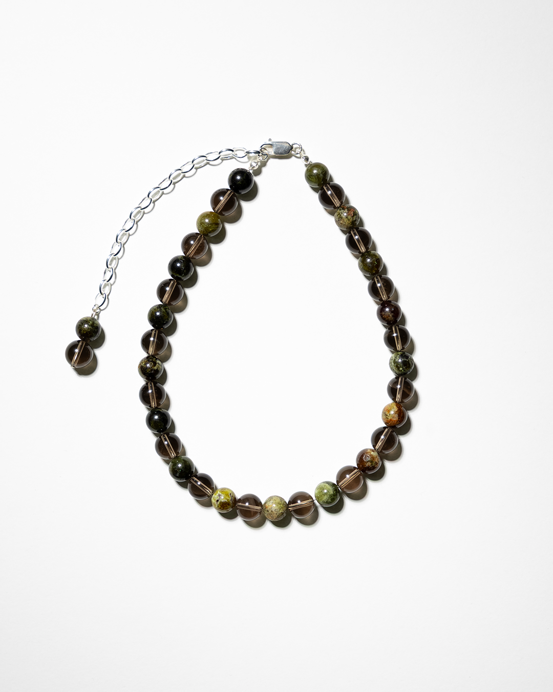 10mm round smoked quartz and green jasper beads — paired one-to-one in earthy contrast, with a rich brown translucence set against cool mineral green. Finished with 925 sterling silver hardware and a 10cm belcher chain extender, sealed with a final bead.