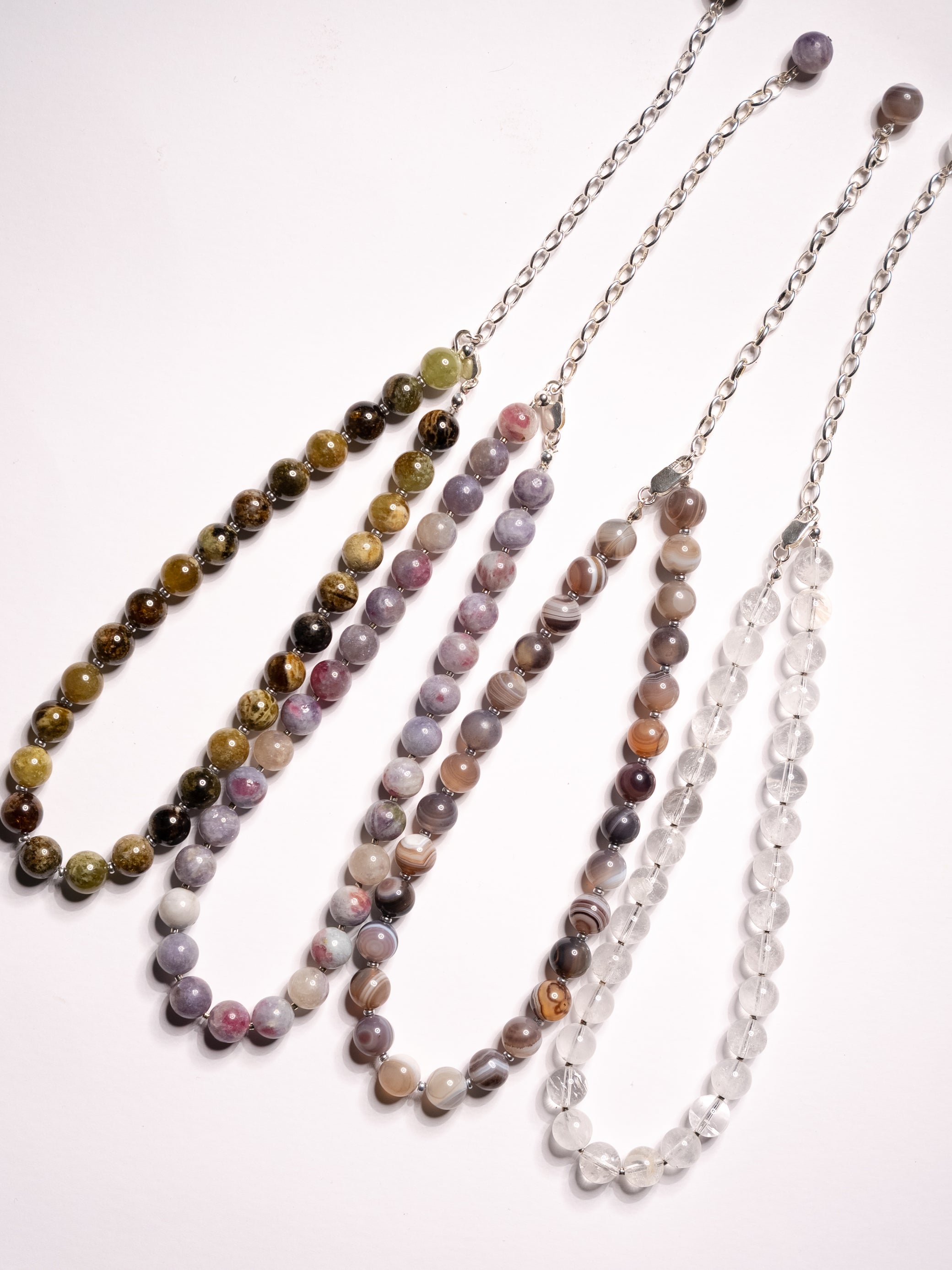Materials are sourced both locally and overseas, with a focus on semi-precious and precious stones, recycled beads, and high-quality glass. Each one is chosen for its tone, texture and longevity. If it doesn’t wear well, it doesn’t make the cut.
