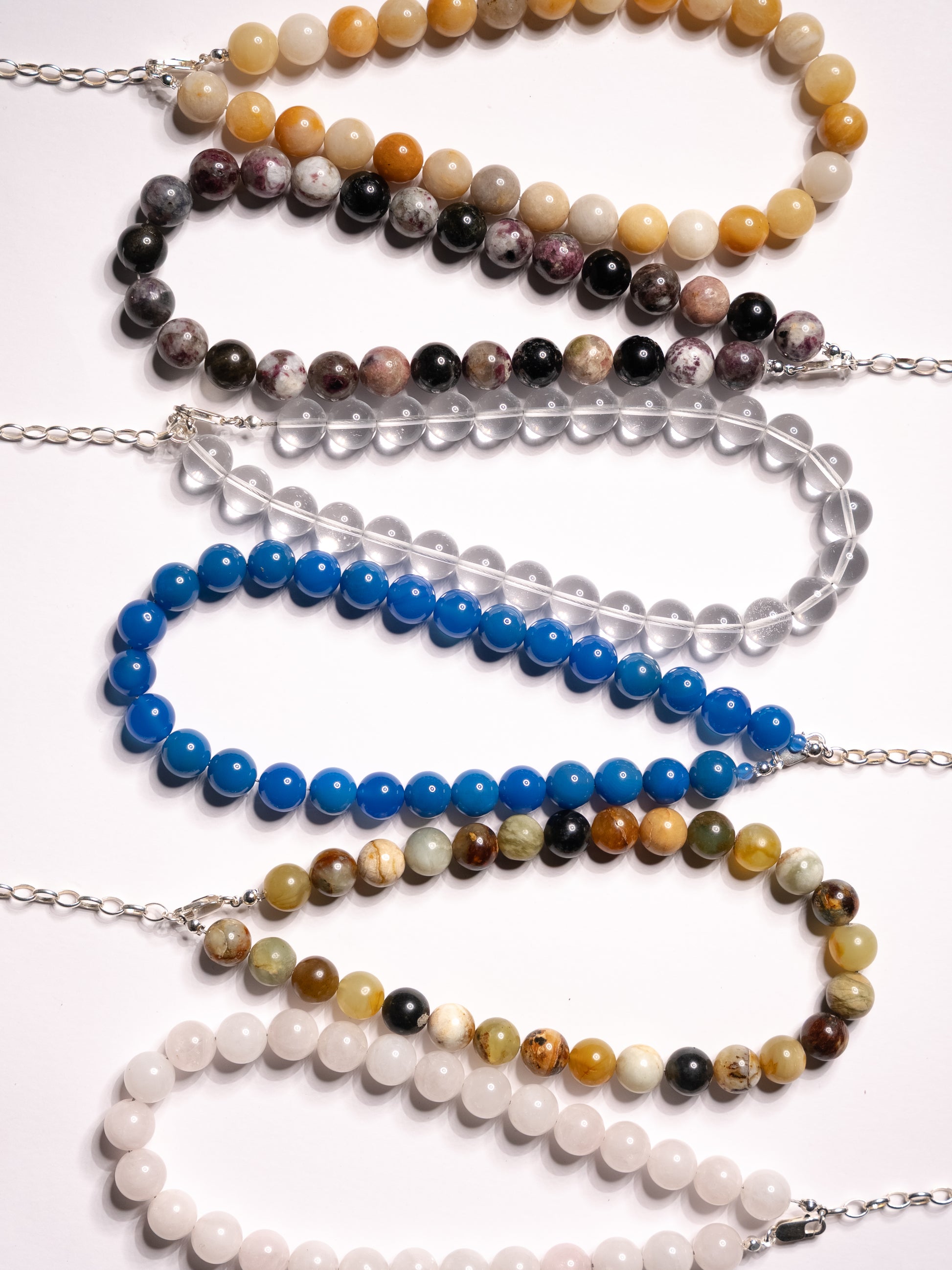 Materials are sourced both locally and overseas, with a focus on semi-precious and precious stones, recycled beads, and high-quality glass. Each one is chosen for its tone, texture and longevity. If it doesn’t wear well, it doesn’t make the cut.
